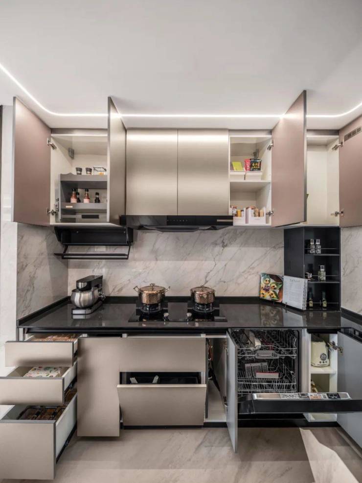 而在厨房,这种极致收纳的思维被简化为“一步原则”:收纳空间全部打开,几乎能填满整个厨房空间,这些收纳空间不是随意塞满的,而是根据日常烹饪习惯的频率来贴心规划的,能保证你在操作半径内触手可得,整个烹饪能一气呵成.