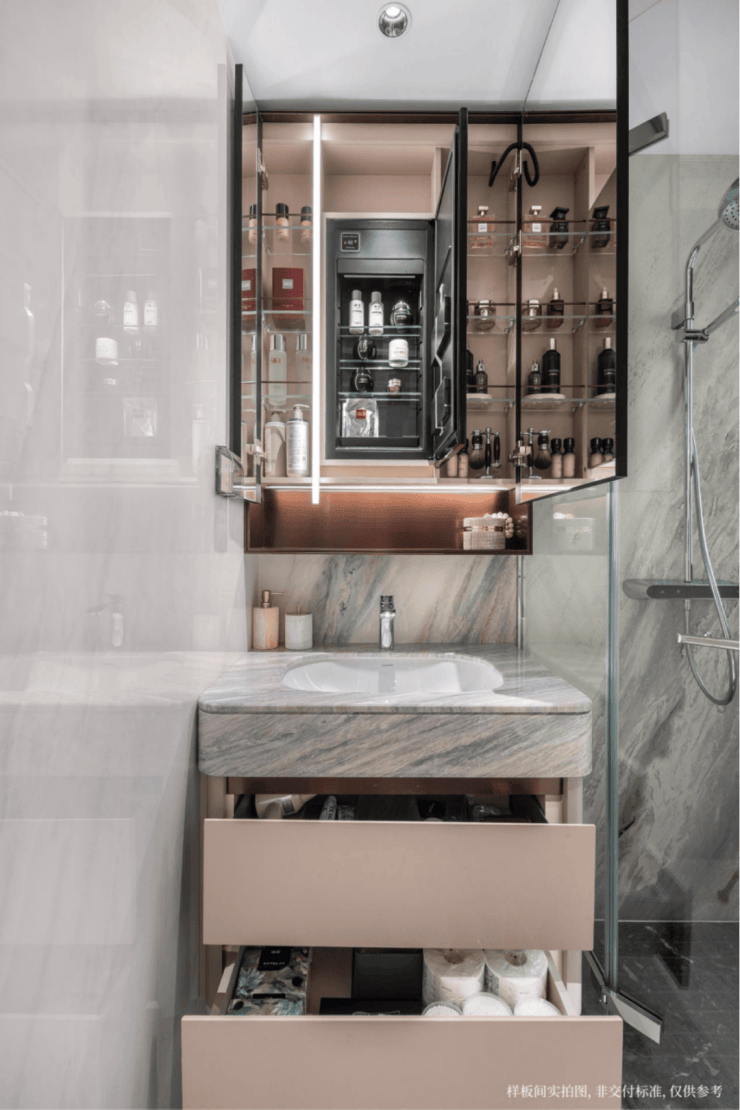 整个镜柜收纳空间,不仅设计了方便拿取的壁龛,还贴心配置了一个可调节温度的美妆冰箱,贴心储存口红面膜等护肤品.