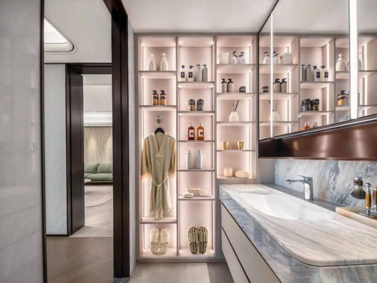 在主卫区域,建发直接用了一面墙的区域打出一个薄柜,设计了大小不一的壁龛,大到挂放浴袍睡衣,小到能摆放耳环戒指,方便日常的贴心取用.