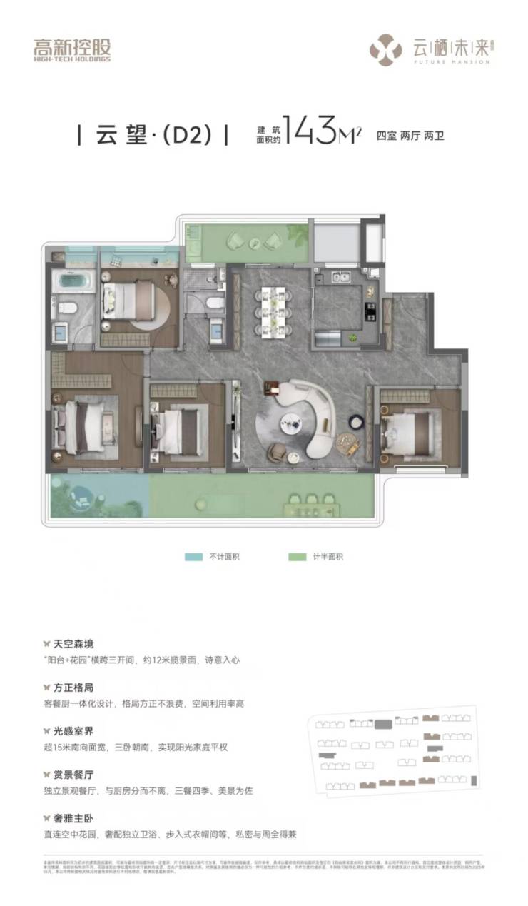 空间革命性突破:采用LDKBG五维交互布局(客厅+餐厅+厨房+阳台+花园一体化),143㎡户型南向面宽达15.2米,部分户型使用率超95%,主卧含衣帽间、独立卫浴及观景飘窗。