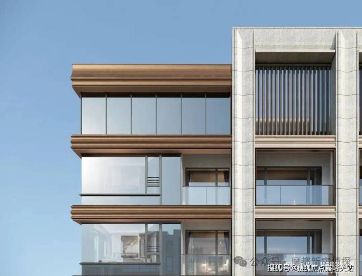 在立面打造上,项目以“石材+铝板”组合成为普陀新的颜值标杆。可视面采用古铜色金属铝板、米黄色铝板/石材,边套搭配270°大转角飘窗,从正面、侧面到背面,立面都保持精致统一的质感。