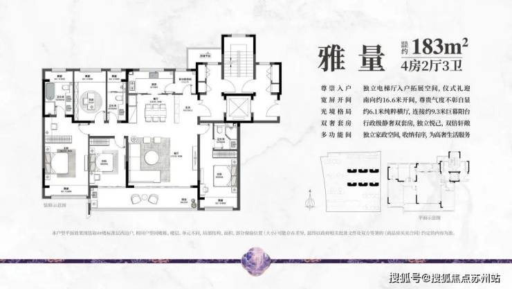 户型设计:每个户型都经过精心设计,空间利用率高,采光通风良好。特别是183㎡洋房,四房两厅三卫设计,南向面宽约16.6米,搭配双联宽景阳台,约6.1米超大横厅,双套房设计,主人房有步入式衣帽间、四分离大卫浴,得房率高。