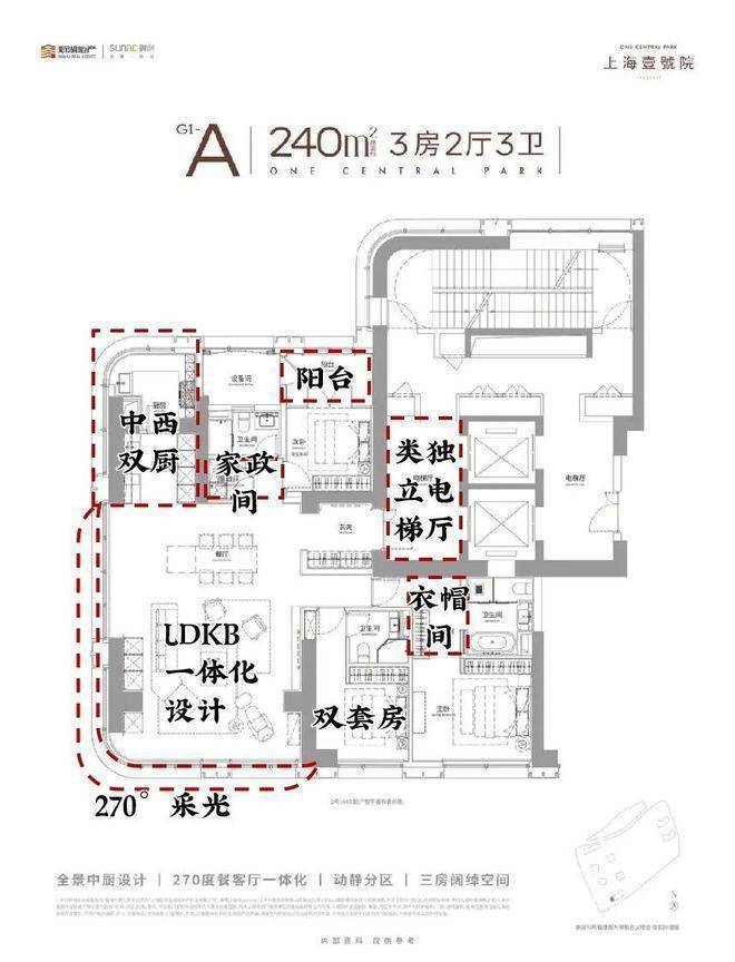 此外,全系采用两梯两户设计,电梯为对开门,电梯厅空间完全私享!在户型设计上,其最大约15m南向三面宽、5大弧形全景舱、中西厨设计等,通过通透格局与开阔视角,将私密性与全景视觉体验完美结合,以创新形态重塑高端住宅的空间美学标杆!在豪宅产品力打造这件事上,上海壹号院可谓是不断突破创新;