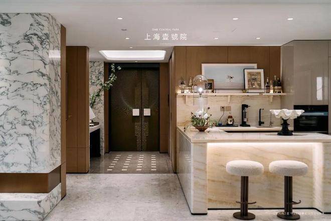 【上海壹号院官方售楼处咨询热线】400-8673-567(24小时服务,人工客服8:00-22:00) 据了解,玄关地面采用土耳其进口的星灰大理石;公区地面为巴宝莉灰大理石通铺;西厨的岛台台面采用条纹白玉通铺,线条感十足;玄关墙面及背景墙,则选用进口皇家玉石,温润而典雅.(实际以开发商交付/公示为准)