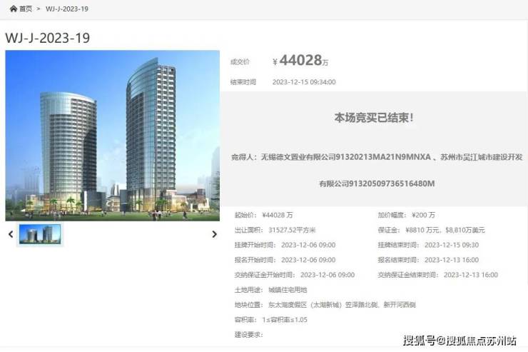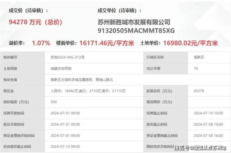 苏高新太湖科学城12号地块项目,即,苏地2024-WG-Z12号地块,位于高新区太湖科学城龙康路西、青城山路北,2024年7月10日,苏高新以总价94278万元竞得,成交楼面价16171元/平,溢价率1.07%。