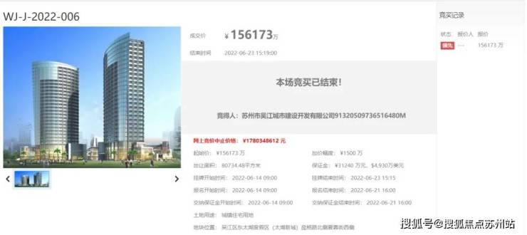 在今年7月,苏州瑞嘉商业发展有限公司以13197万元的总价竞得该地块,成交楼面价20500元/平,溢价率0%。