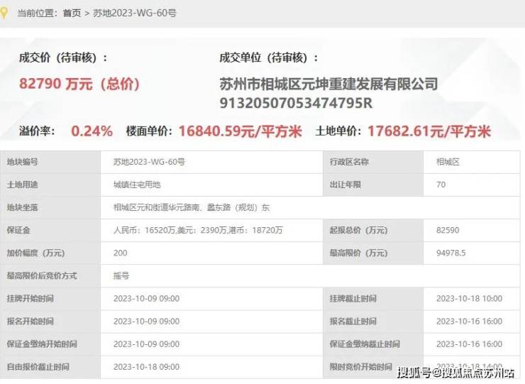 元坤重建60号地块项目,即,苏地2023-WG-60号地块,位于相城区元和街道华元路南、蠡东路(规划)东,是2023年10月18日,元坤重建以总价82790万元竞得,成交楼面价16841元/平,溢价率0.24%。