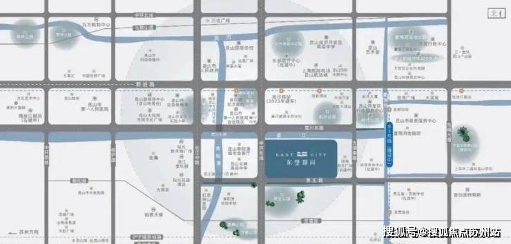 [双极城市门户]:向西约2公里即达青阳港城市中心,向东约3-5公里接驳夏驾河科创走廊与体育公园[双城动脉融汇]:轨道交通S1号线、前进路、中环东路、震川东路、景王路、长江中路、沪宁高速[ 政经双极之核]:昆山市政府、东区行政中心、开发区政府、昆山市政务服务中心、昆山市应急管理局[双面繁华主场]:左拥金鹰购物中心、九方购物中心、大润发、万达广场 右揽世茂广场、首创奥特莱斯[ 双面菁英优教]:上海华二昆山国际学校、景王路一贯制学校(在建)、昆山国际学校、青阳港实验学校、震川中学[双享宜居胜地]:黄浦公园、景王公园、时代公园、体育公园、夏驾河湿地公园、黄兴公园[双重医疗保障]:昆山第一人民医院友谊院区、东部医疗中心(在建中)、宗仁卿纪念医院