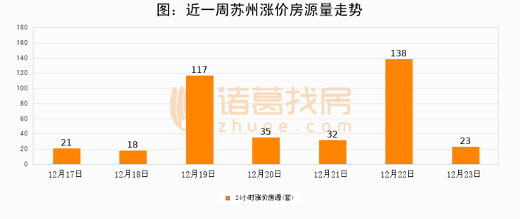 根据诸葛找房数据显示,苏州24小时涨价房源量为23套,较12月22日减少115套,环比下降83.3%。与此同时,涨价房源占比小幅回落,对于购房者来说是一个入市窗口期,购房者可抓住时机入市。