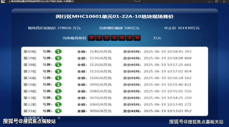 6月19日,闵行1幅地块出让,地块名称为颛桥镇MHC10601单元01-22A-10地块,规划用地性质为住宅用地,出让面积4.05公顷,容积率为2。经过40轮竞拍,最终由上海保利城市发展有限公司竞得,总成交价314026万元,溢价率12.95%。