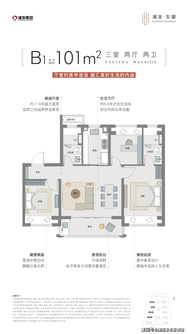建面约101㎡B1户型尺度感惊人,约5.2米南向面宽的客餐厅以及阳台,为室内带来了非常出色的采光度。