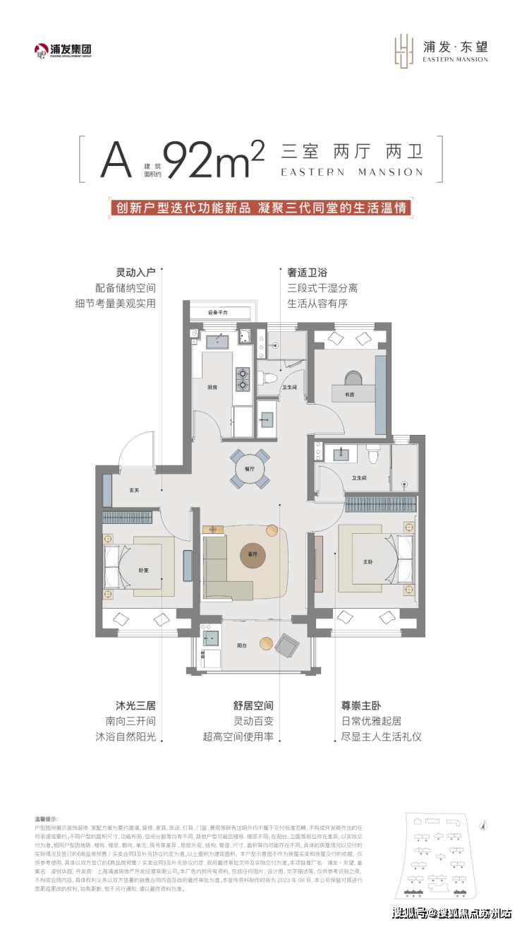 建面约92㎡3房产品市面上大多都是1卫的设计,但浦发东望为2卫的设计,实用性超高的同时,空间也较为宽绰。