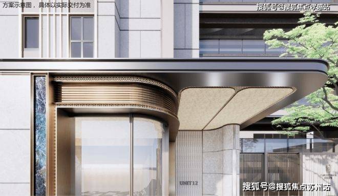 在楼栋主入口同样运用石材+弧形铝板等元素,同时还有格栅装饰,质感提升明显: