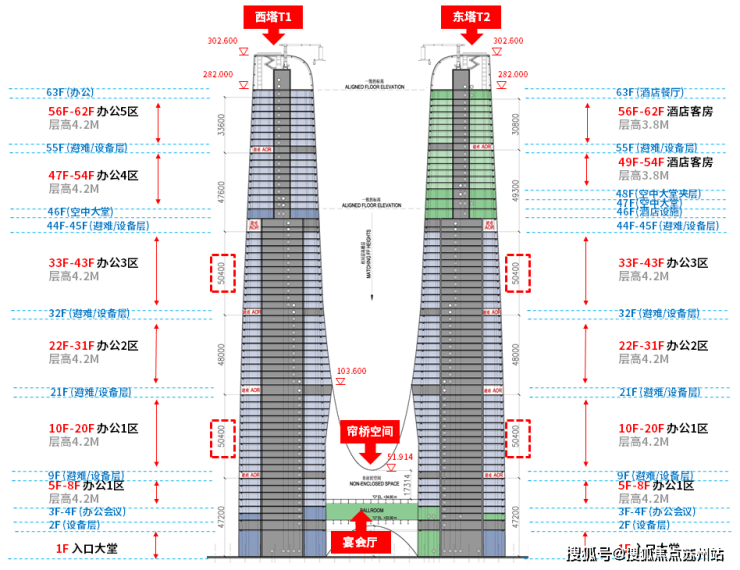 【层高】:4.2米,顶楼5.3米,双塔均设直升机停机坪