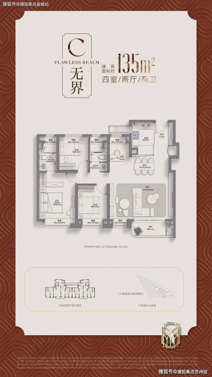 135㎡四房两卫大横厅设计,南向采光面达8.4米,主卧套房融入独立衣帽间;