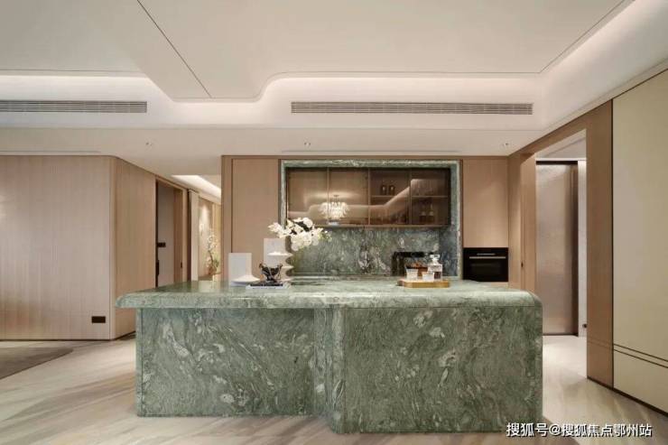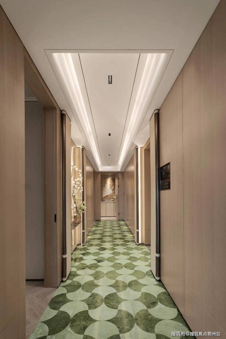 主卧的锤纹门把手、地板花瓣拼、镂花的空调出风口每一个都是世界级的工艺。同样,精装的用材也很考究,从电梯厅到室内各种奢材在这里齐聚, 瑞士翡翠、白雪公主、蒂芙尼绿、巴黎金等奢石,还有仿锤纹夹丝玻璃、仿古锈镜、隐木这些罕见用材增添艺术质感。