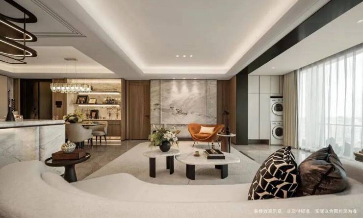 室内大量运用奢石,搭配统一木饰面与皮革材质,通过圆弧设计、隐形出风口、无高差客厨地面等“隐形美学”处理,让奢华与舒适完美融合。