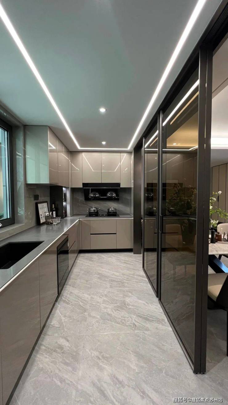 另外,厨房内的吸油烟机、水龙头都选用了市面少见的 智能感应款,做饭时完全不用担心将油污抹得到处都是!厨房内部上下柜凹槽做好的,贴心程度满分!