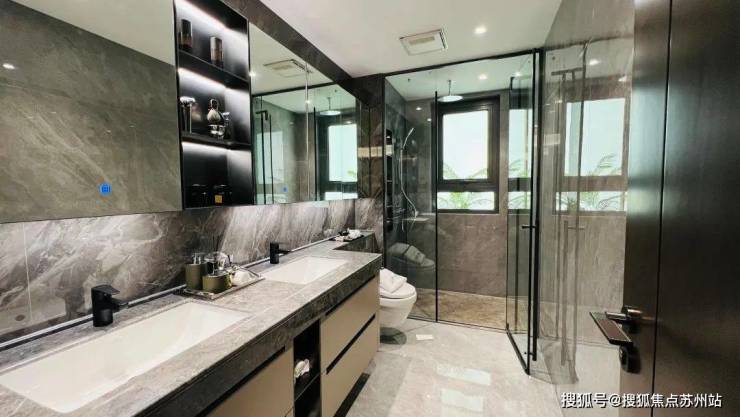 主卧套房更是选用了 双台盆,这基本是到了180㎡+才有的配置,并且整个台面采用了 整块石材,成本高昂,市面上非常少见!