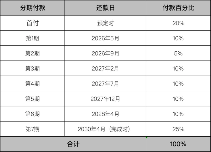 6. 分期付款:根据开发商的付款计划,按工程进度分期支付剩余房款,一般每1-6个月支付2%-10%不等。