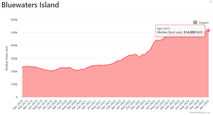 Meraas打造的蓝水岛(BluewatersIsland)社区,地处JBR海岸线,拥有AinDubai摩天轮,近三年来房子均价涨幅104.69%,租金的上涨也明显,部分一居单位年租金达20万迪拉姆,近三年来租金均价涨幅83.11%。