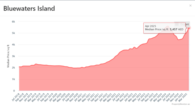CityWalk作为迪拜核心地段中少有的综合体街区住宅,自带地段红利与品牌溢价。根据DXB数据,近两年平均房价316.7万迪拉姆,涨幅44%,每平方英尺平均单价2600迪拉姆,涨幅27%,表现远超迪拜住宅市场平均水平,尤其是中高层精品公寓产品,涨势稳定、抗跌能力强。