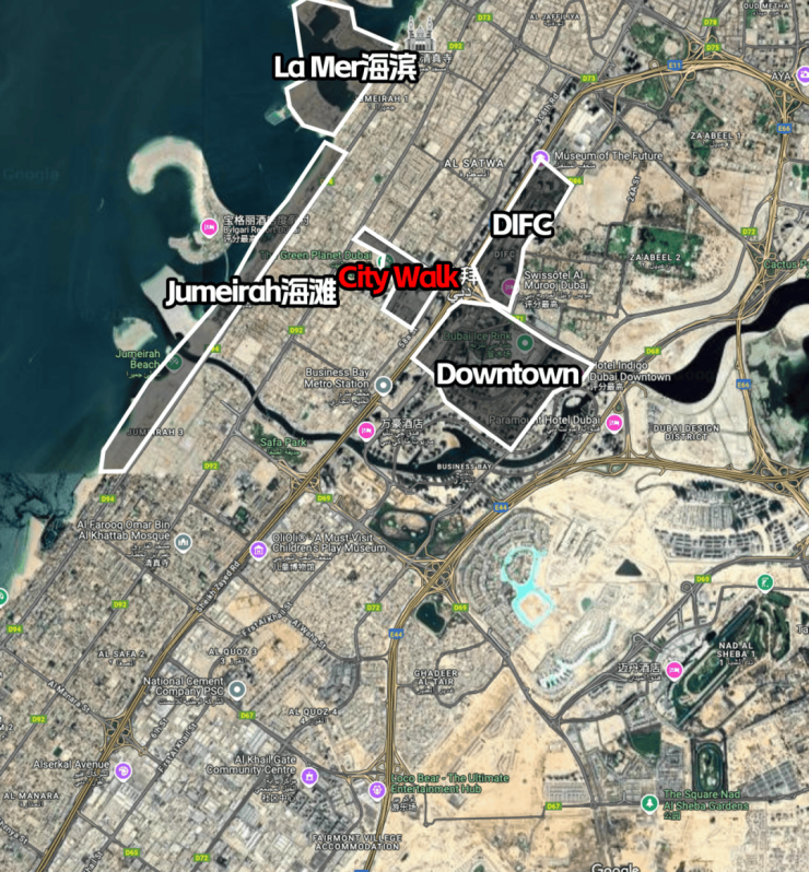 从地图上看,CityWalk几乎处在迪拜城市最核心的区域交汇点:
