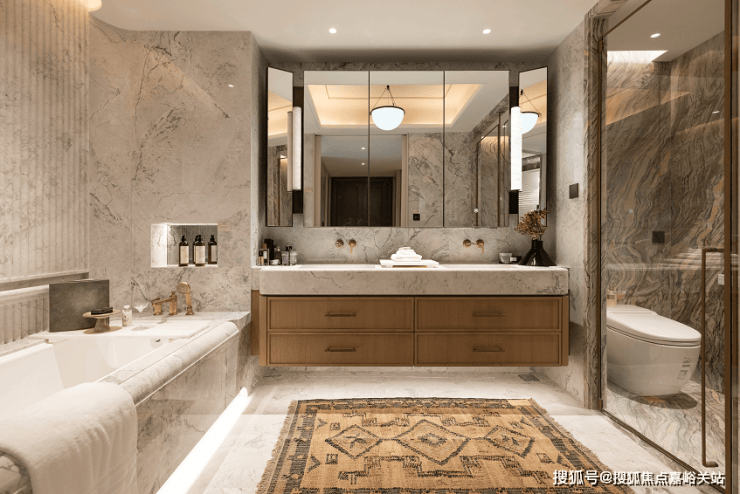 卫生间多处采用弧形处理,并设计了很多人性化细节,例如浴缸装有内嵌式扶手、边角为圆弧处理、台面增加古典腰线处理的挡水条,提升颜值的同时提升使用的便利。