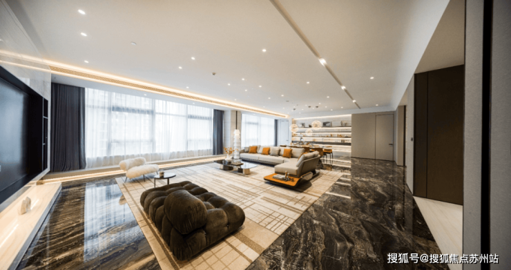 百年罗汉松 造价千万石材 约11米挑高大堂让想象力不再受限:大堂挑高约11米,仅石材用料价值千万,地面采用名贵进口石材劳伦黑金,成就身份与地位的彰显。顶部汲取德国世博馆设计灵感,通过材质分隔,演绎力量感与艺术气息。恢弘气势与毫厘细节,可按需定制全场景美学,