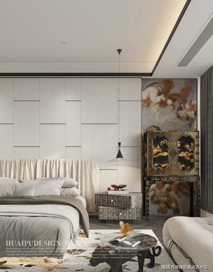 在诗意和美好里,充满活力、对比鲜明又平衡地营造出幸福的氛围,在喧嚣的一天后在这里放松身心,床脚隐于床下,灯光亮起,如同悬浮,空间清透舒适,金属花纹勾勒如一扇窗点缀秩序俨然的背景墙,搭配丘比特艺术感墙布,近距离欣赏经典的魅力,去感受艺术回归生活的美好,舒适感与情调满满。