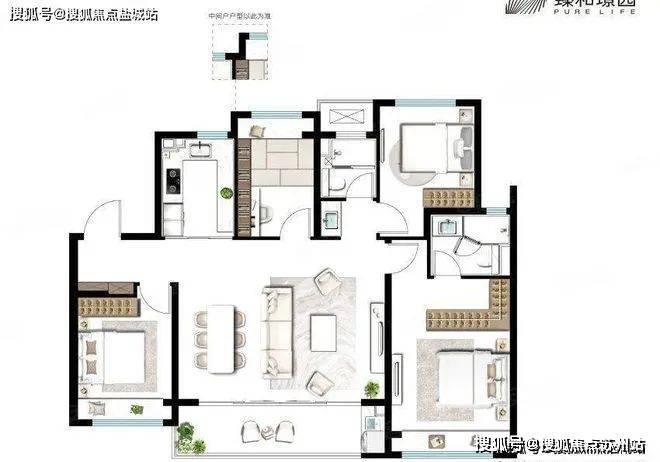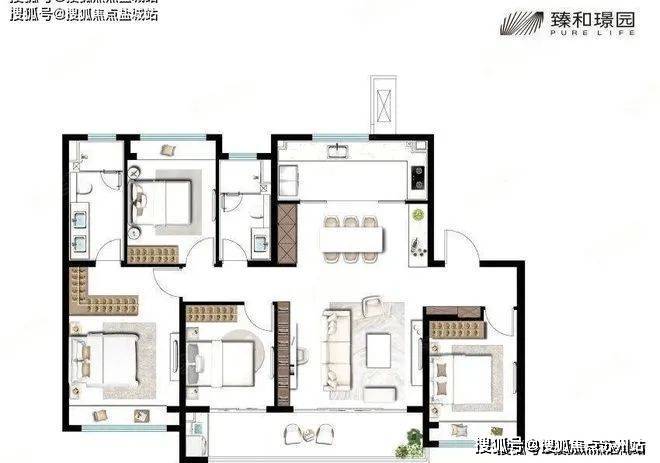 苏州园区「招商蛇口臻和璟园」建面约143㎡全屋大4开间朝南,其中横厅开间达到约4.8米,并且和餐厅、厨房贯通,整个公区的尺度感不言而喻;