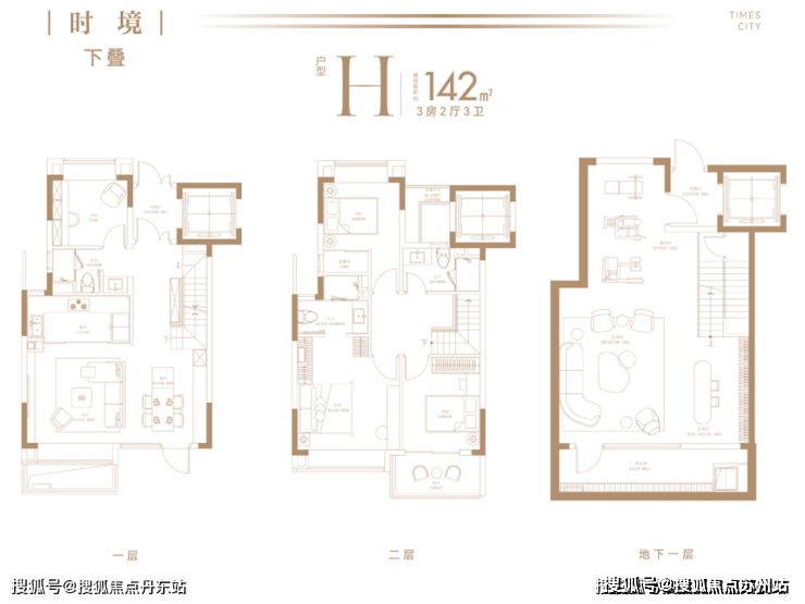 以建面约142㎡下叠为例,地上两层、地下一层阔绰空间,动静科学布局,全面考量三代同堂与二胎家庭的居住空间需求,以人性化质感空间演绎舒奢生活。