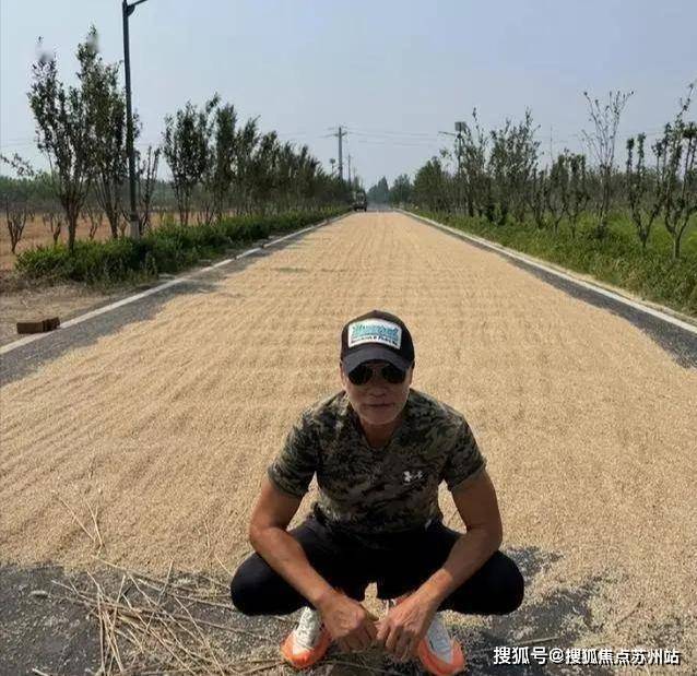 照片中,任达华上身穿着一件迷彩服,下身穿着一条黑色裤子,然后戴着墨镜和一顶黑色的帽子,穿着朴素像极了一位老农民,最显眼的应该也就是他那一双橙色的运动鞋了,与周围的黄色小麦和土地显得格格不入。