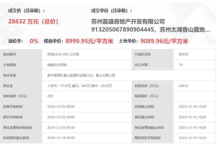 又见江南,即苏地2024-WG-Z36号,位于吴中度假区香山街道孙武路以北、香山北路以西,去年12月,苏州嘉盛房地产开发有限公司、苏州太湖香山置地有限公司以底价28632万元竞得该地块,成交楼面价9000元/平。