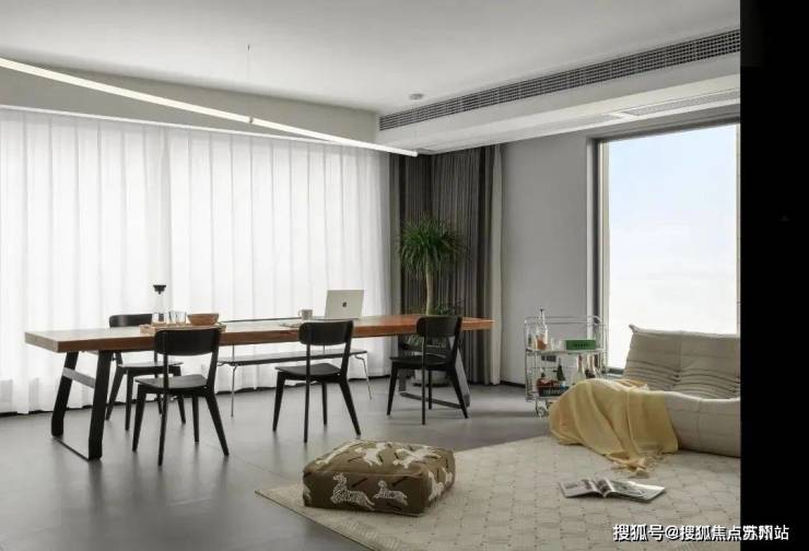 客餐厅采用一体化的设计,空间更加区域敞亮,恰到好处的留白带来了更多的高级感,用懒人沙发和长桌来划分空间,这种划分空间的方法不隔断空间,更加有层次,点线面结合更富东方的美学意境,让人与空间之间相互深度交流.