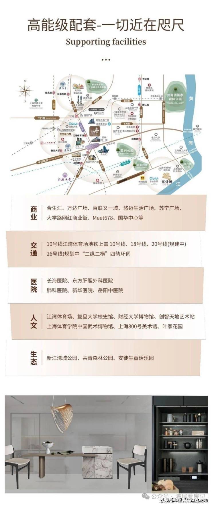 交通配套:地铁10号线江湾体育场站上盖,步行3分钟可达,规划中的18、20、26号线距离项目200米内;自驾可通过中环路、翔殷路隧道、淞沪路高架,30分钟可达浦东机场.