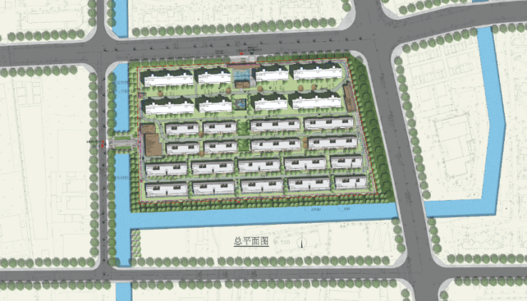 小区在南厍路和经六路上分别设置地库和人行出入口。整个小区中轴对称式排布,且双面临水。