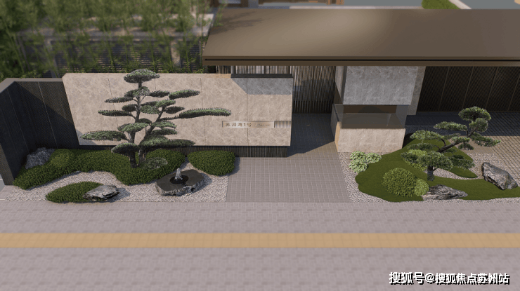 同时大门配有水钵,黑松,这样的搭配不仅视觉上效果更好,也能中和掉材料本身的冷感。