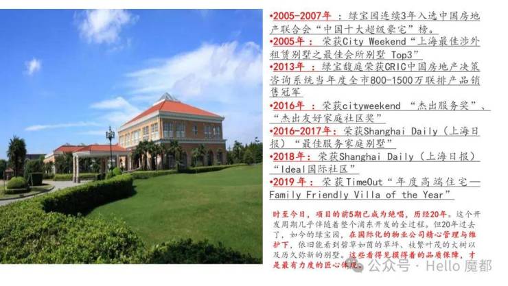 绿宝园别墅位于南汇康桥开发区,奠基开工于1999年,占地近40万平方米,迄今共推出5期产品及“绿宝.馥庭”,经过多年的开发已成为上海成熟高档的别墅社区之一,曾连续三年被评为“亚洲十大豪宅”,其多年来以纯正的美式规划,美式物管等西方的概念和执行。项目从规划之初即定位于打造具有北美风格、以外籍客户为主的涉外高档社区,在知名规划与设计团队的主导下,致力于高标准的设计、高品质的建筑、经验丰富的管理团队为住户提供全新的生活标准。