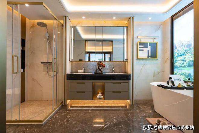 卫生间甄选唯宝的台下盆、汉斯格雅的龙头+恒温花酒,玫瑰岛的淋浴房,科勒的智能一体马桶+浴缸+浴缸龙头等,生活质感肉眼可见。