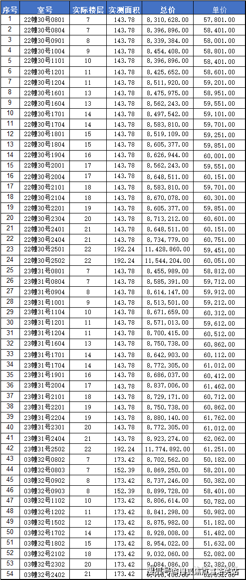 阳明花园广场二期(二阶段二期)一房一价表