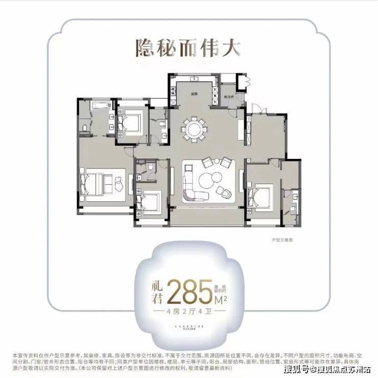285㎡ 4房4卫:2梯2户设计,5开间朝南,客厅开间7.4米,主卧开间5.5米,总价约1268万起(单价46493元/㎡起)25。
