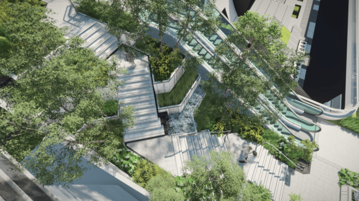 除南侧无敌城市视野外,楼王北侧与3#楼间距约60米,享奢阔栋距,同时又将森感公园的葱郁树冠纳入窗前画卷,南北景观环绕.值得一提,项目高线公园打造“三大花园·六大游园”体系,提供丰富的体验场景,而在楼王东侧就是三大花园的其中之一,也是艺术感最强的一个花园,将结合艺术装置和台阶,为业主提供舒适闲坐、眺望树冠景观的空中露台.