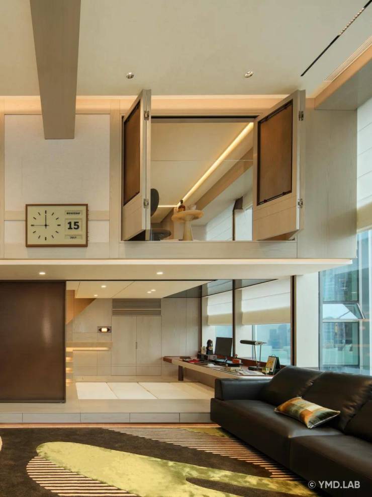 沿悬浮楼梯拾级而上,则抵达完全私密的 「双雅憩空间」。这里是与自我深度对话的领地,是安放热忱与灵感的阁楼。一面是沉浸式的「松弛空间」,另一面是功能完备的休憩领域,可开可合。