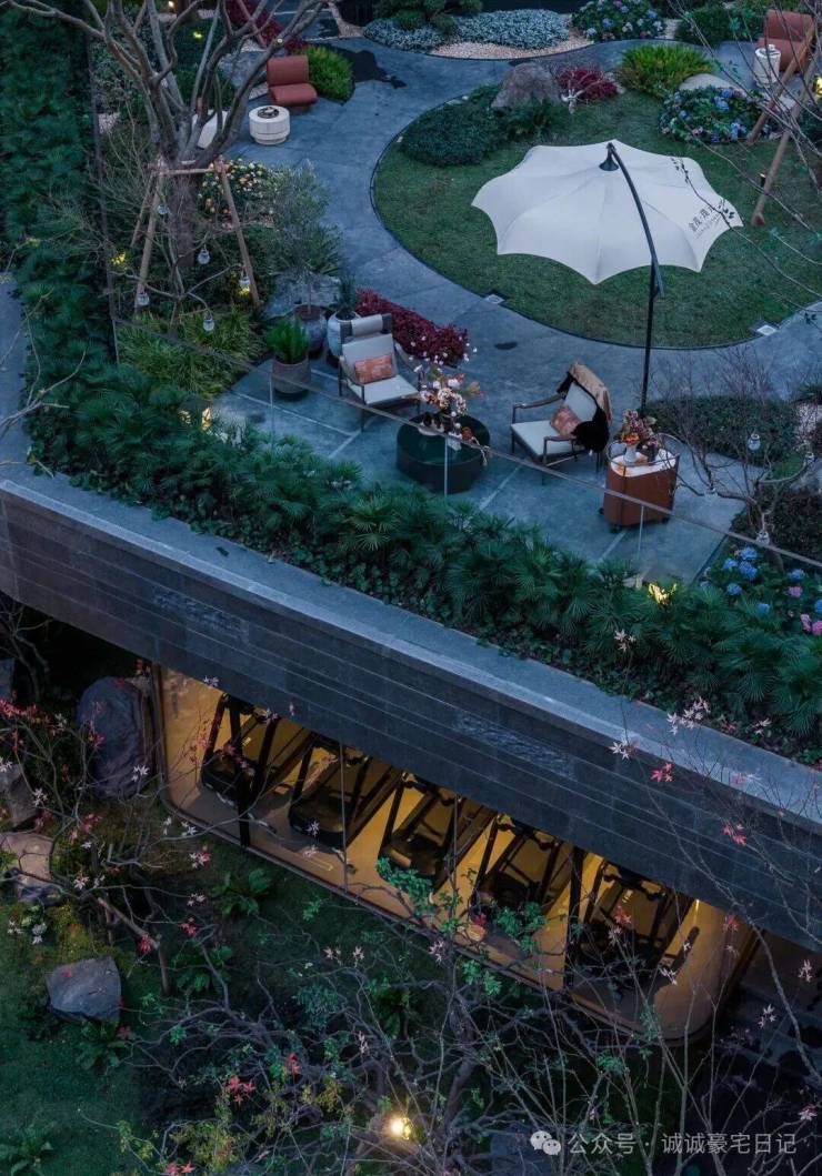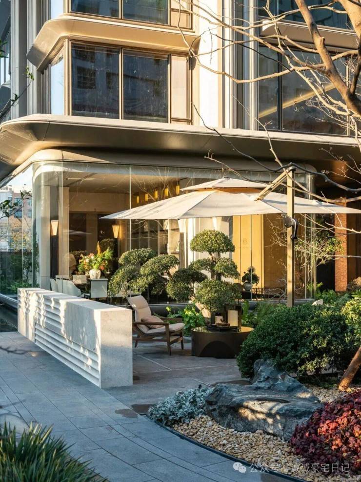 而在3、5号楼之间,则搭建了【围炉夜话】场景空间。古木纹奢石砌成的火炉旁,整木炭化石凳散发着山林野趣,一株红舞姬枫树翩然伴舞。冬日傍晚,好友围坐,体会名门温情。