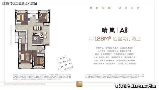 128㎡四房两卫:双阳台(6.4米景观阳台+生活阳台),四开间朝南,主卧衣帽间,全屋超10处收纳系统约81.26%