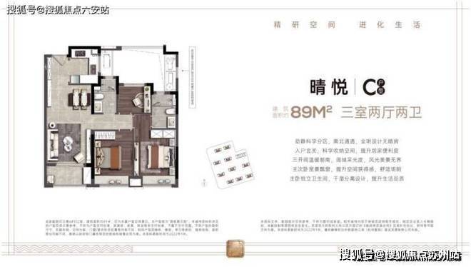 89㎡三房两卫:三开间朝南(面宽近9米),U型厨房+主卧套房+双卫,LDK一体化设计,总价94万起约81%