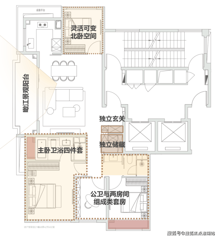南向双卧室,主卧升级套房,可做双衣柜,门口次净衣区,连贯主卧卫生间,整墙衣柜最大化收纳可能性;另一间南卧与公卫,可组成类套房,早晚使用流线便捷;