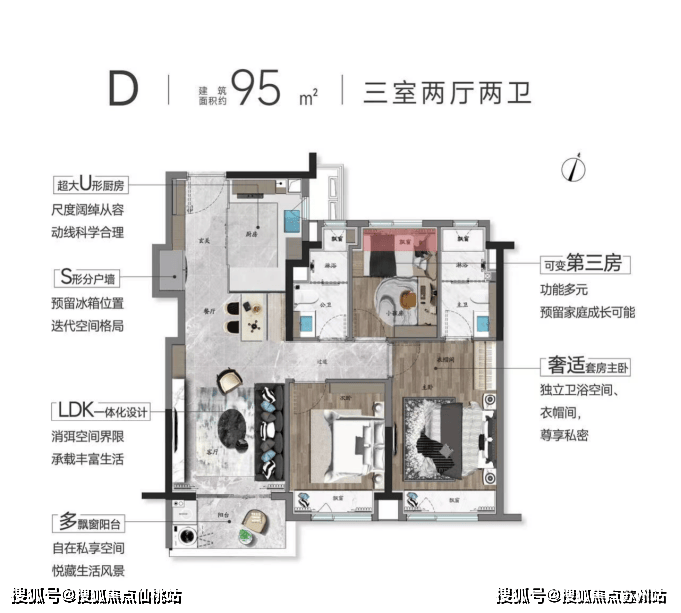 臻席在售户型为建面约92-95㎡3房房源