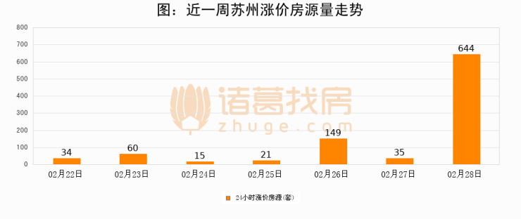 根据诸葛找房数据显示,苏州24小时涨价房源量为644套,较02月27日增加609套,环比上涨1740%。与此同时,涨价房源占比小幅扩大,业主信心有所提升。